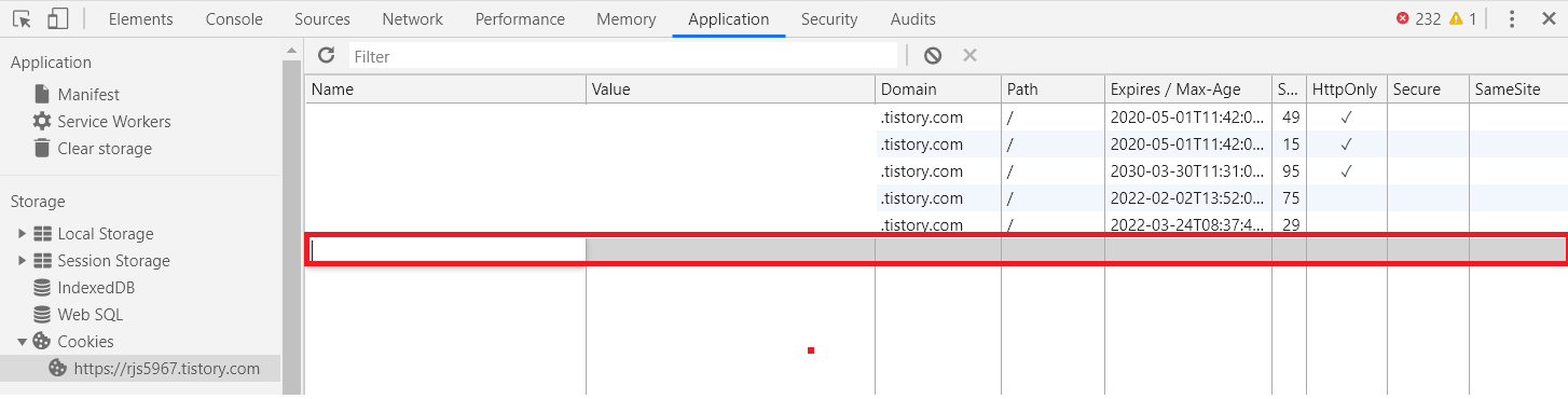 만약 쿠키값이 없다면 빈 공간을 클릭하여 직접 쿠키를 생성할 수 있다.